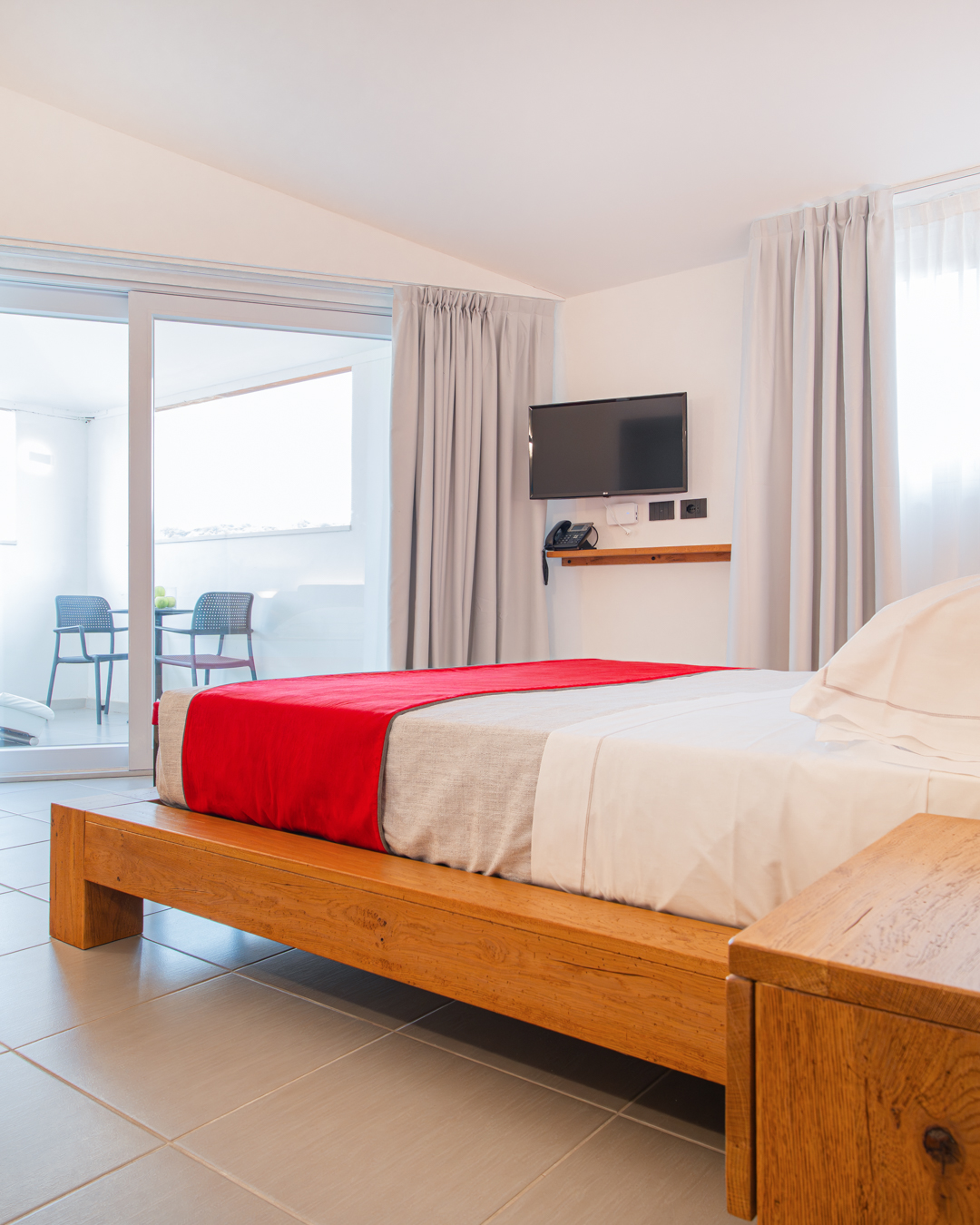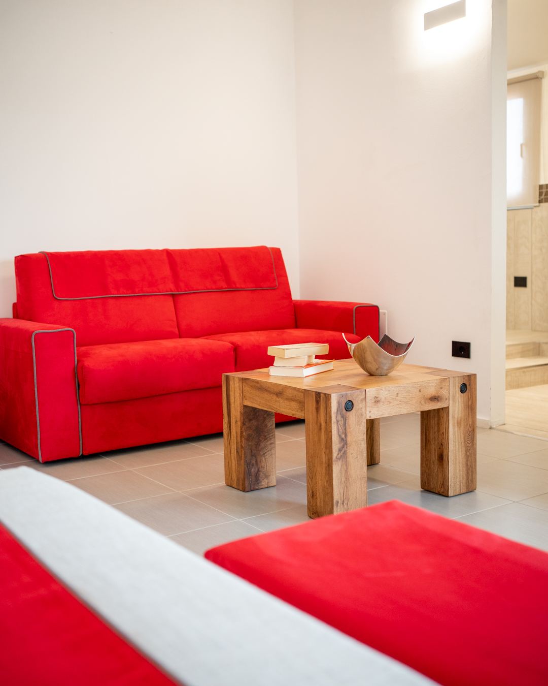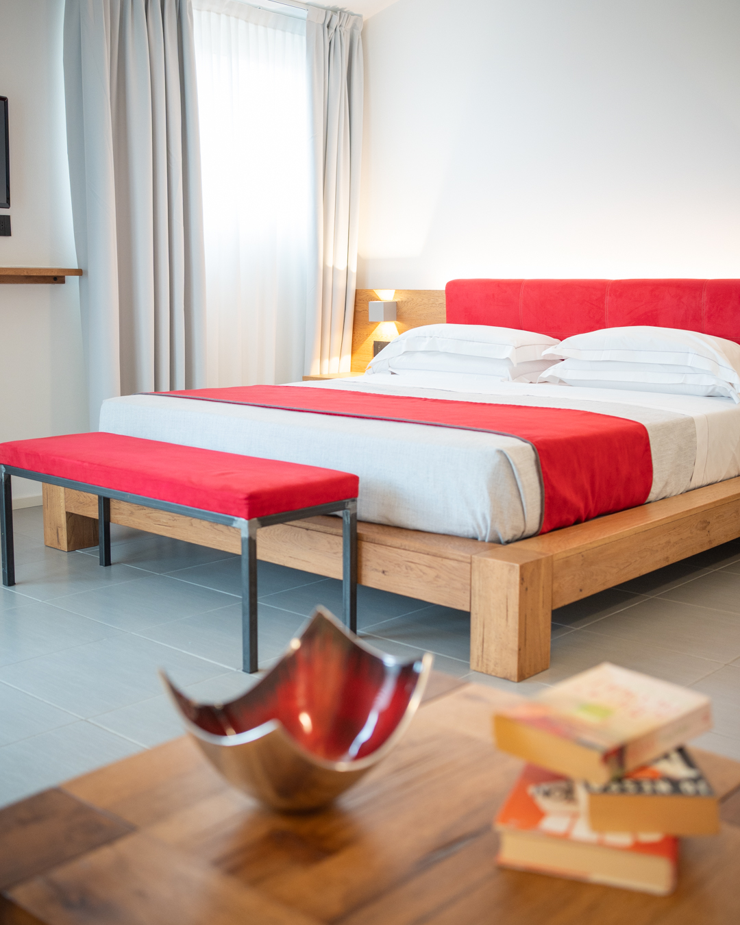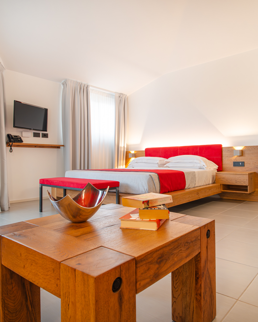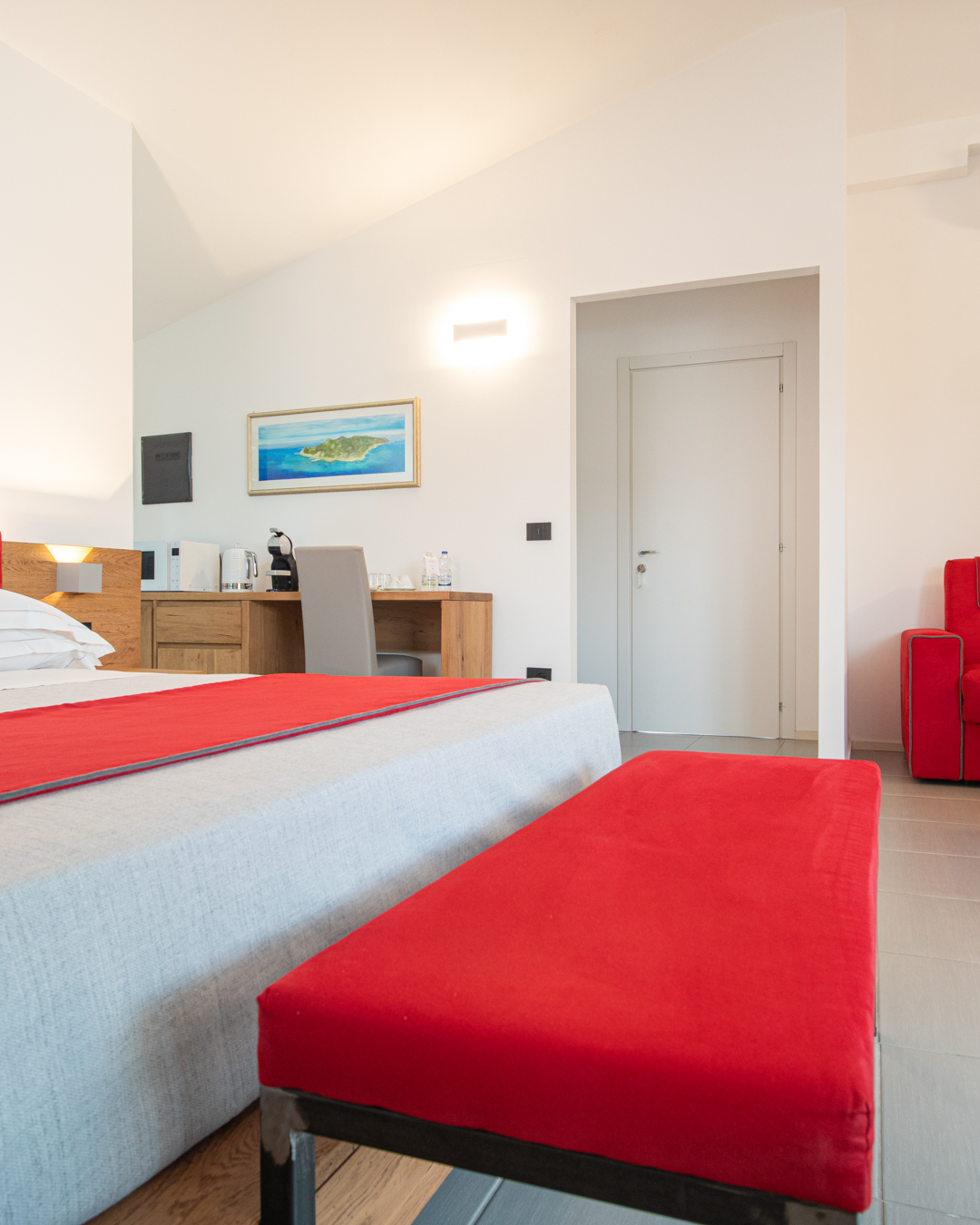 Suite di 40 mq con letto king size e divano letto. Luminosa e spaziosa, caratterizzata da uno stile minimalista con un mix di colori dal porpora al legno chiaro che rendono la camera raffinata e moderna. Situata all’ultimo piano in posizione angolare, dispone di un balcone con vista sul giardino privato dell’hotel. Un comodo disimpegno all’ingresso ed una cabina armadio calpestabile e capiente. L’ampio bagno presenta una parte sfalsata con gradino dove son posizionati i sanitari e doccia multifunzione, dotato di ampia finestra che permette alla luce naturale di illuminare l’ambiente. Tv schermo piatto 49” con Sound Bar system.