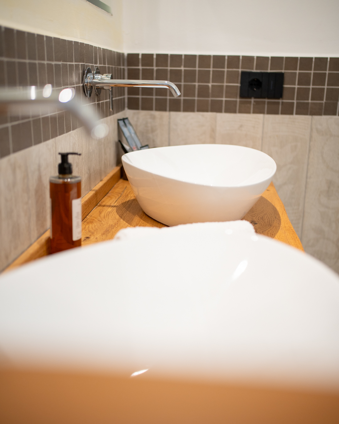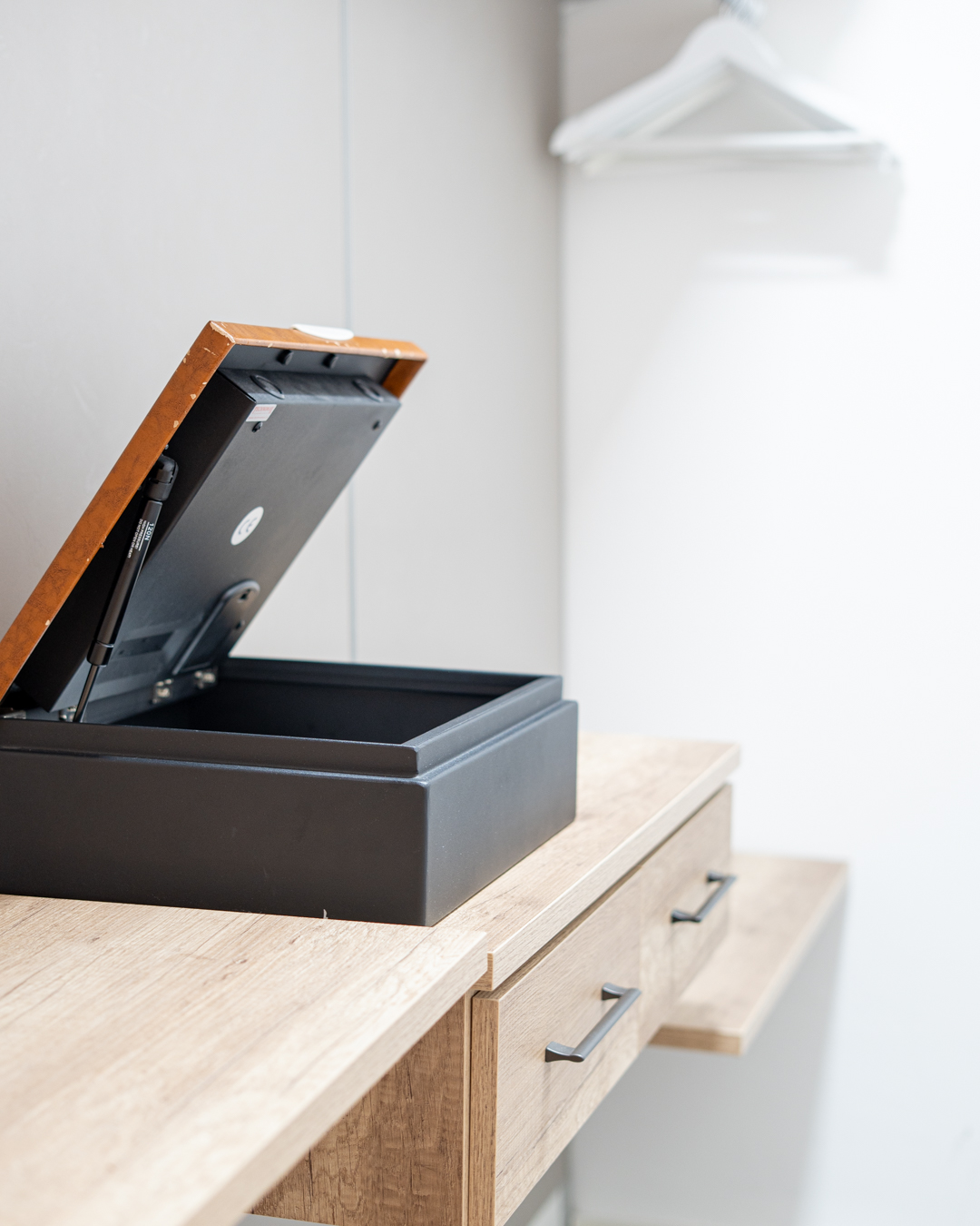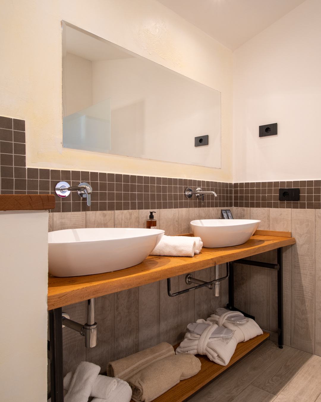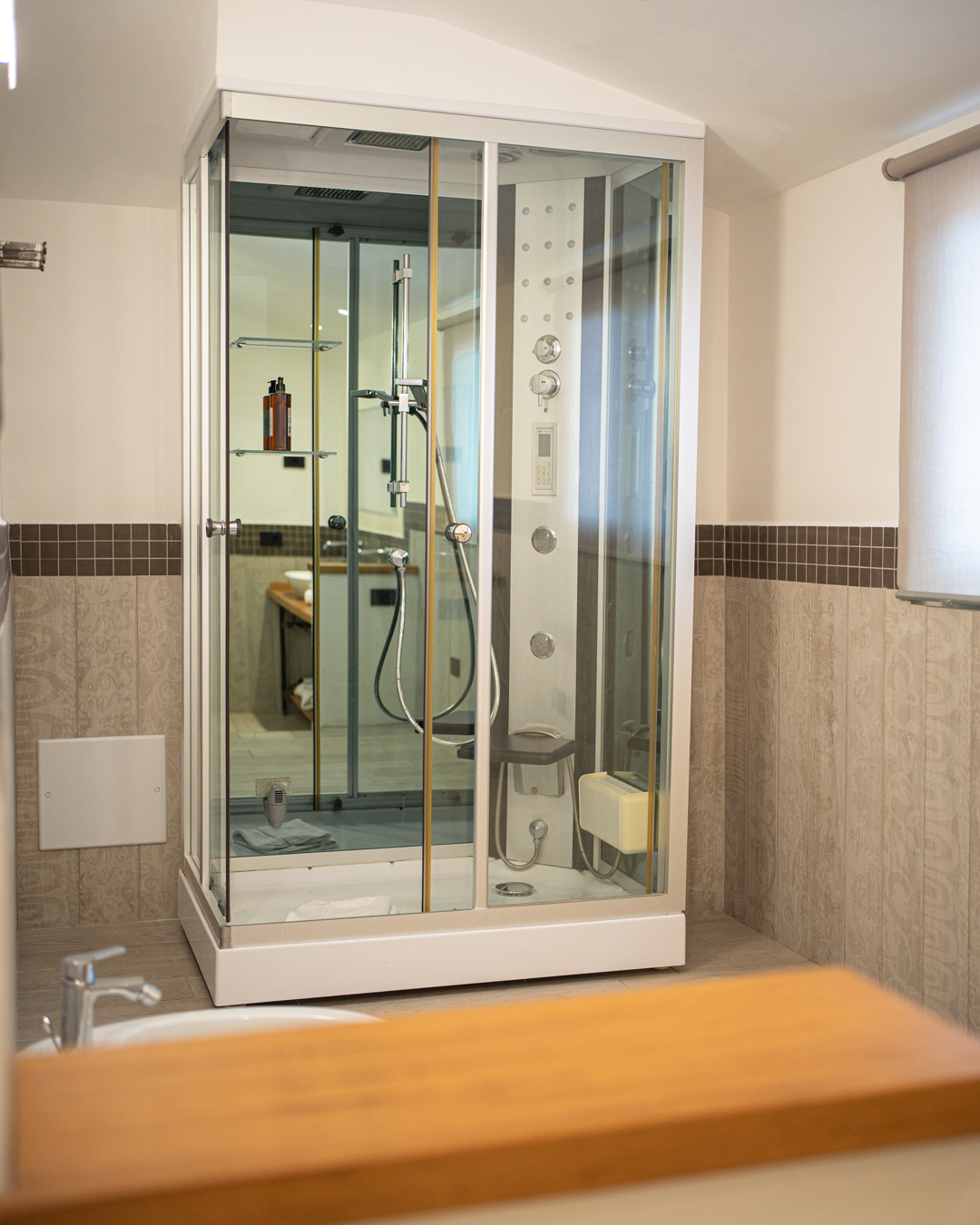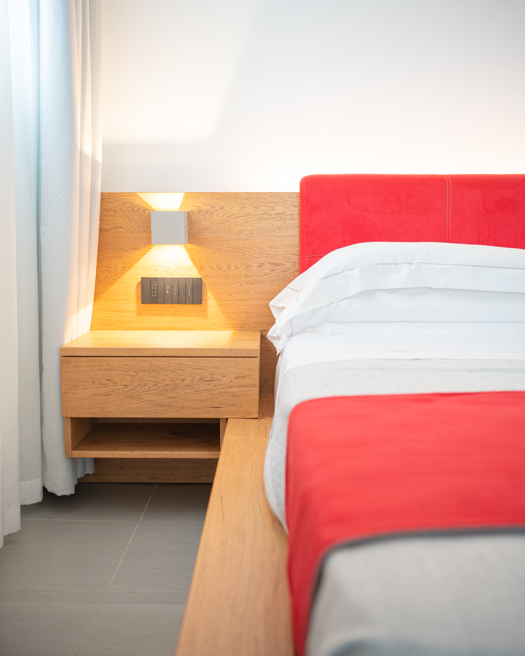 Suite di 40 mq con letto king size e divano letto. Luminosa e spaziosa, caratterizzata da uno stile minimalista con un mix di colori dal porpora al legno chiaro che rendono la camera raffinata e moderna. Situata all’ultimo piano in posizione angolare, dispone di un balcone con vista sul giardino privato dell’hotel. Un comodo disimpegno all’ingresso ed una cabina armadio calpestabile e capiente. L’ampio bagno presenta una parte sfalsata con gradino dove son posizionati i sanitari e doccia multifunzione, dotato di ampia finestra che permette alla luce naturale di illuminare l’ambiente. Tv schermo piatto 49” con Sound Bar system.